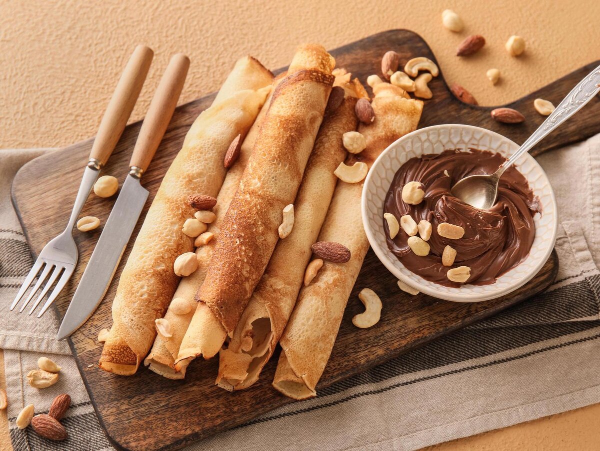 Блинчики – это лакомство, подходящее для употребления в любое время дня, снискало признание сердец бесчисленных сладкоежек по всей планете. Их легко обнаружить в ассортименте большинства кафе и ресторанов, а также в меню любителей домашних блюд. Это кушанье может варьироваться от простой и непритязательной до роскошной десертной вариации, опираясь на выбор начинки. Использование шоколада и орехов преобразует традиционные блинчики в подлинное произведение кулинарного искусства, способное удовлетворить вкусы самых искушенных сладкоежек. Поделюсь с вами потрясающим рецептом, к которому вам захочется возвращаться снова и снова. Ингредиенты (на 6 персон): Приготовление: Теплые блинчики с шоколадом и орехами наиболее вкусны, так как начинка в них нежная и кремовая. Чтобы сделать блюдо еще вкуснее, можно декорировать его свежими ягодами или дополнить кремом или йогуртом. Это лакомство прекрасно сочетается с холодным молоком, горячим кофе или какао – сладкоежки точно оценят. Еще больше интер