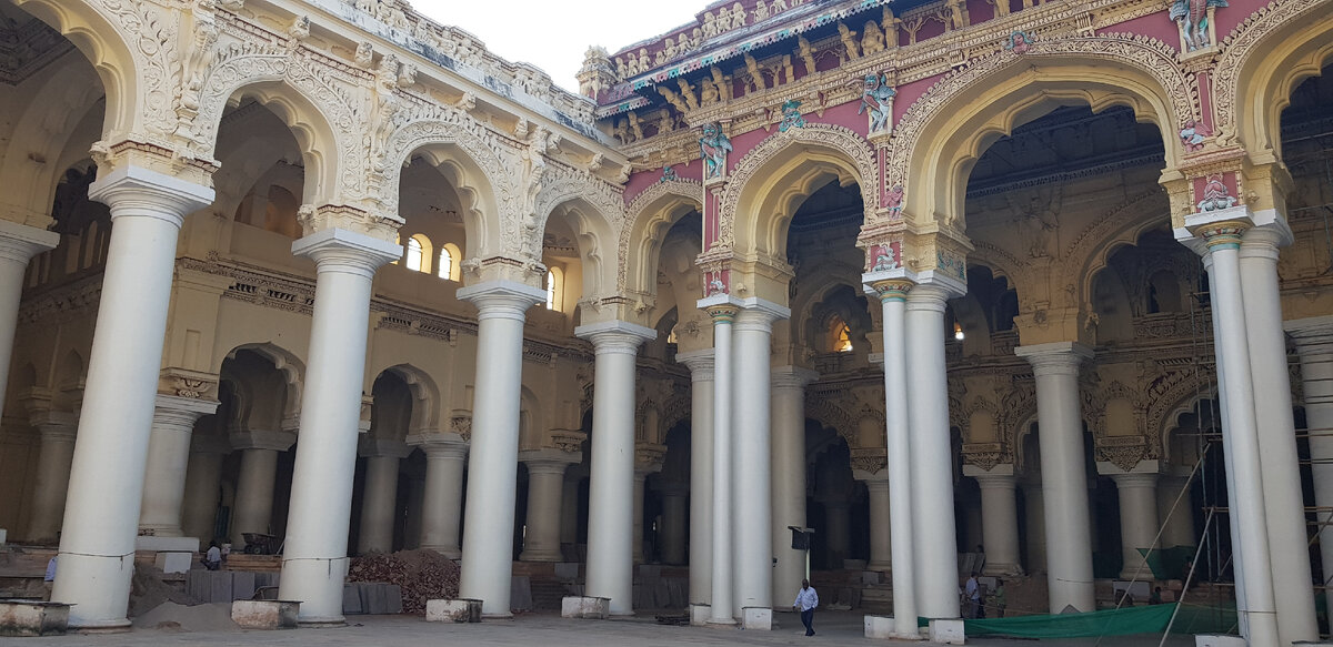 Красота бывает изящной, а бывает мощной и монументальной. Когда я увидела этот дворец, то второе определение сразу пришло мне в голову - мощный! Огромные колонны поддерживали узорчатый свод, а над всем этим расстилалось небо! Не правда ли, колонны напоминают что-то греко-римское? Говорят, что великий король народа телугу Тирумала Наяк (1623—1659) нанял итальянского архитектора для постройки этого дворца. Но арки сделаны в причудливом сочетании дравийской (так называется стиль индуистских храмов южной Индии) и мусульманской архитектуры. Во дворе стоят стулья для представлений: Но на данный момент насладиться можно было только "музыкой" строительно-дробительных-бурительных инструментов. Внутренняя часть дворца также украшена колоннами. Тогда как внешние колонны высоки и стройны, внутренние колонны "крепки и коренасты". Они-то и производят впечатление "мощности". Если снаружи арки вычурно украшены, то внутри - лаконичны и подчеркивают форму, а не узоры. Если поднять глаза, то мо