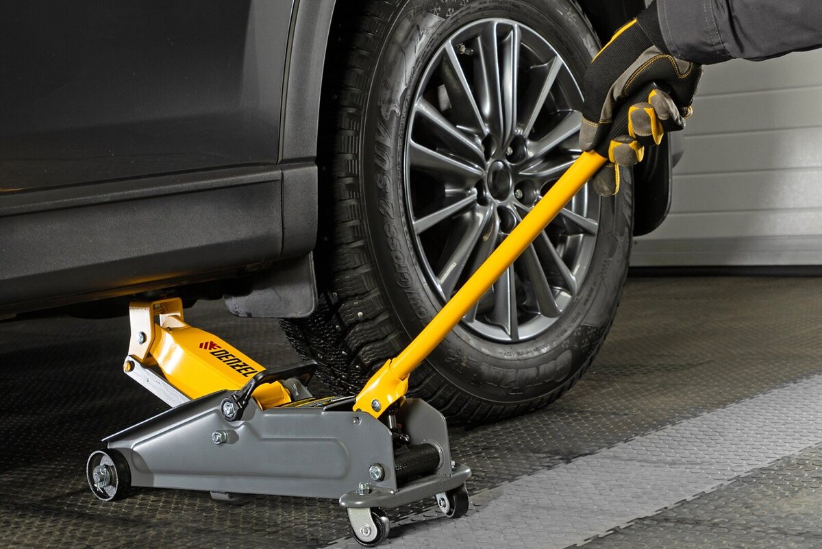 Иметь подкатной домкрат в гараже для личного использования – это удобно. Демонтаж колес доступен независимо от очередей и графика работы сервисов. В этой статье рассказываем, на что обратить внимание при самостоятельной работе с домкратом. Характеристики в ПТС Перед выбором домкрата внимательно изучите характеристики своего автомобиля. Грузоподъемность домкратов для личного использования варьируется от 2 до 3 тонн, чего вполне достаточно, чтобы поднять стандартную легковую машину или внедорожник. В случае превышения грузоподъемности в домкратах Denzel срабатывает защитный клапан, предотвращающий поломку механизма. А вот с высотой подхвата и подъема есть риск промахнуться. Линейка домкратов Denzel для гаража имеет высоту подхвата от 85 мм до 150 мм и высоту подъема от 330 мм до 582 мм. Выбирайте с расчетом на то, какой у вашей машины клиренс и на какую высоту необходимо ее поднять. У гидравлического домкрата Denzel с артикулом 51230 высота подхвата составляет 135 мм. Он предназначен для