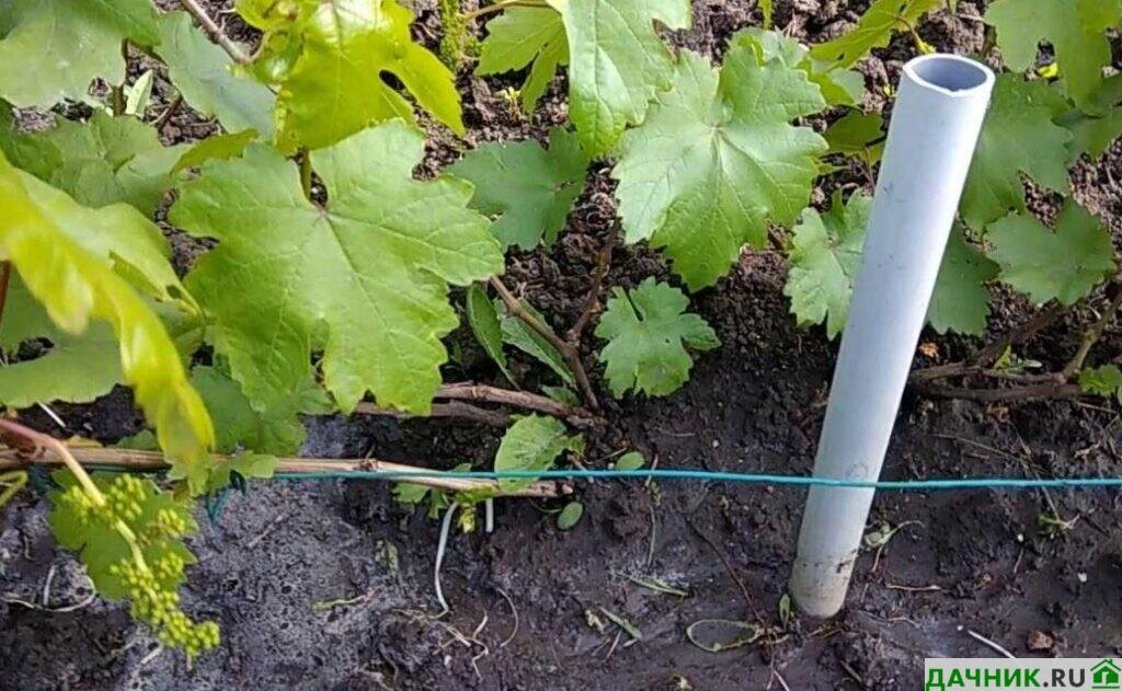 Для обеспечения корневой подкормки в виде раствора устанавливают трубу из пластика или асбеста диаметром 8-12 см с отступом 60-70 см от корня виноградного куста. Труба вкапывается на глубину не менее 40 см, чтобы обеспечивать растения питательными растворами, которые быстро достигают корневой массы. Трубу можно заменить, обустроив вокруг куста канавки глубиной до 40 см, в которые также вливают жидкое питание и затем присыпают землёй.