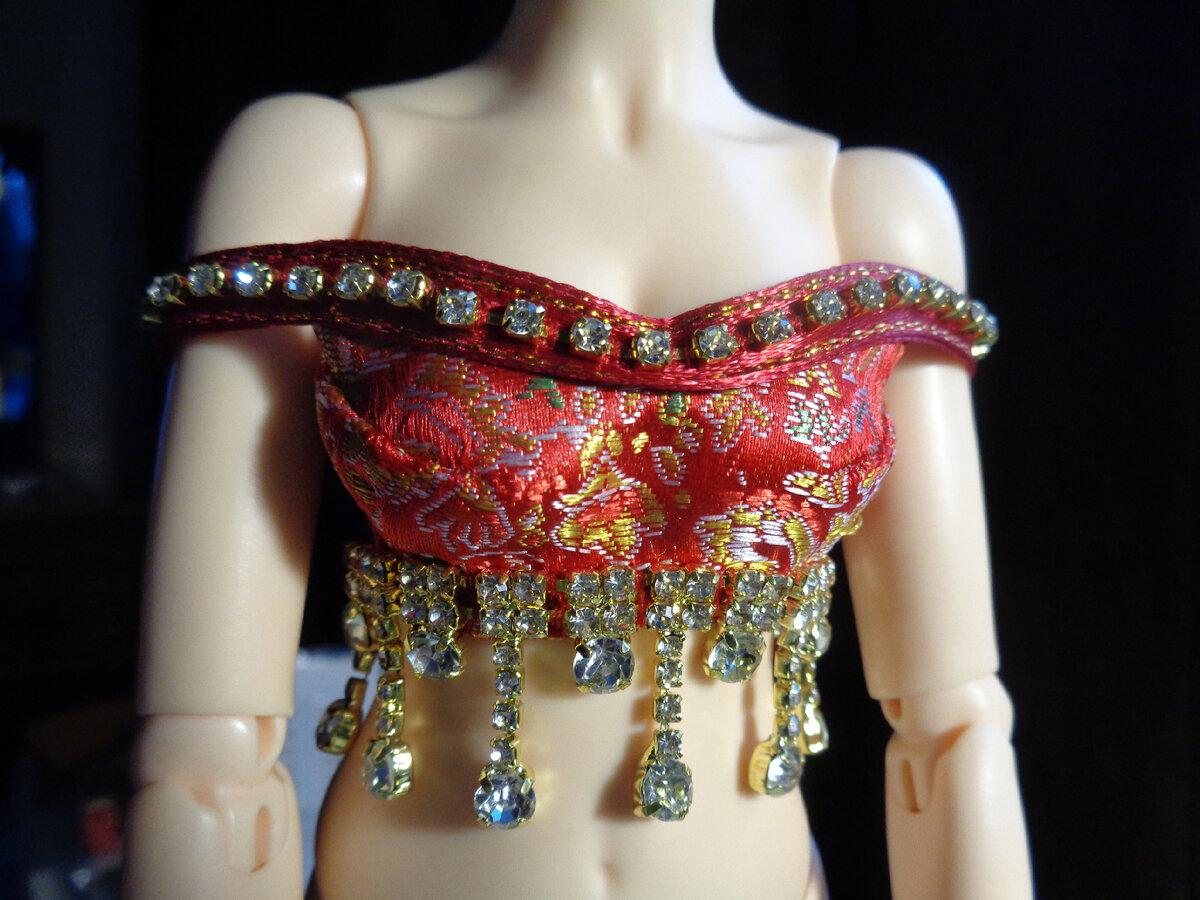 Итак, основной костюм Лета - шальвары и халат. В процессе пошива выяснилось, что их лучше не совмещать, а сделать два разных образа - поскромнее и более соблазнительный. Начала с бюстье: основная ткань - узорчатый жаккард, декор - бисерные цепочки. В центр еще нашила золотое солнышко (будет видно на других фото). Далее - пояс. Сперва я его нашила на штаны, но ошиблась с размером и пришлось все распарывать и переделывать. Пояс теперь отдельный. Декор - та же стразовая цепочка и цепочка с золотыми дисками. В центре - то же солнышко (это были серьги, которые специально покупались, чтобы потом вот так распотрошить их и частями нашить на костюм). Шаровары из итальянского батиста, очень тонкого и воздушного. Вот в итоге как эти три вещи смотрятся вместе: Кукла без головы и кистей, пока служит манекеном. Выкройка бюстье сделана макетным способом, на кукле. Вторая часть Лета: нижнее платье, халат и расшитый пояс. Ну и общими станут туфли и головной убор.