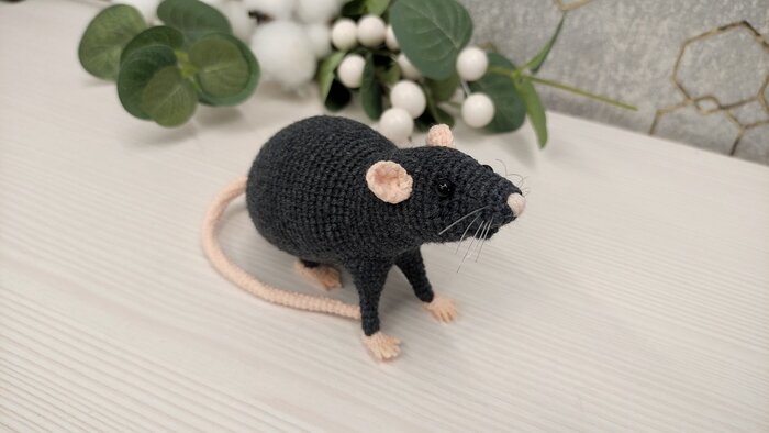 Всем привет! Сегодня делюсь новой работой, которой очень горжусь) Как уже наверно понятно из названия - это крыс) Очень люблю это животное, у самой была крыса, добрейшее и умнейшее создание! Теперь более подробно о второй части названия. Почему же не миниатюрная? Размер конечной игрушки около 23, 5 см (12 см тело и 11.5см хвост) А почему же тогда миниатюра? Потому что связана крыса из очень тонкой пряжи. Вероятно, это будет интересно только вязальщикам, но все же укажу, что крыса вязалась из разделенной надвое пряжей ярнарт джинс. А лапки из разделенного джинса на 4 нити! Использовала крючки 1.25, 1 и 0.75. Я честно очень довольна результатом, получилась конечно не настоящая, но вполне реалистичная крыса) Пряжа хлопок+акрил, наполнитель холлофайбер. Пришивные глазки-полубусины, и леска для усов. А теперь давайте посмотрим на лапки?) Сама лапка размером чуть больше 1см, а пальчики по 5мм. Пропитала клеем, чтобы они держали форму, а не болтались как сосиски. Кстати благодаря этому получи