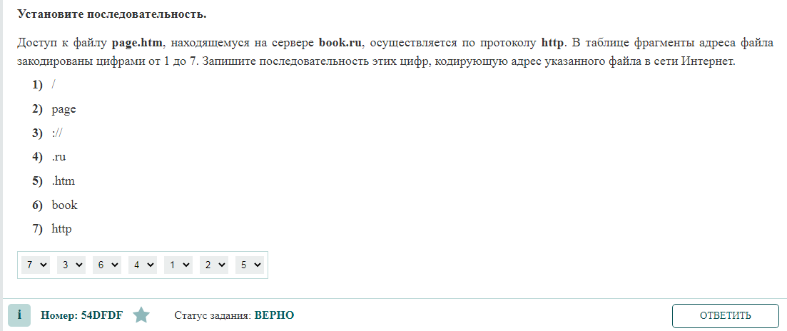 Доступ к файлу page.htm, находящемуся на сервере book.ru, осуществляется по протоколу http. В таблице фрагменты адреса файла закодированы цифрами от 1 до 7. Запишите последовательность этих цифр, кодирующую адрес указанного файла в сети Интернет. 1)/ 2)page 3):// 4).ru 5).htm 6)book 7)http ЧТО НУЖНО ЗАПОМНИТЬ?