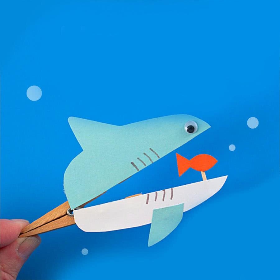 У зубочистки отломите острые края, из оранжевой цветной бумаги или картона вырежьте рыбку, приклейте рыбку к зубочистке, а зубочистку к одной из сторон акулы, как показано на рисунке. Плавник приклейте к нижней части.