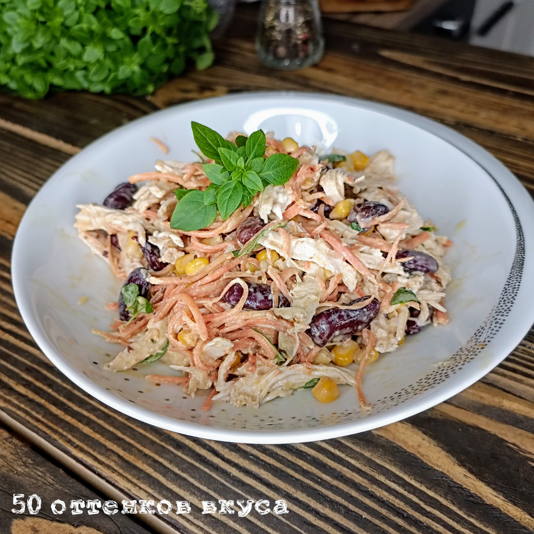Обажаю салатики которые готовятся быстро, а съедаются ещё быстрее. Этот салат из категори на скорую руку. Единственное что нужно готовить для него, это отварить и раздербанить куриное филе. Хоть этот рецепт простой, но салат будет в тему на любой случай. Просто приготовить на ужин или на праздничный стол, не важно. Это очень вкусно, обязательно сохраните рецепт у себя на стене и приготовьте его! И так. Отвариваем куриное филе в подсоленной воде с одним листиком лаврового листа и затем остужаем. Берём удобный тазик, ссыпаем в него сладкую кукурузу, красную фасоль, морковку по корейски. Туда же дербанем на волокна остывшее куриное филе, добавляем листики свежего базилика, рубленные ножом грецкие орехи, соль по вкусу и майонеза, без него ни куда. Перемешиваем салатик, раскладываем по тарелкам и наслаждаемся! Приятного аппетита! Понадобится: - куриное филе 400 г - морковь по корейски 200 г - кукуруза 1 б - фасоль 1 б - грецкие орехи 10 шт - пучок базилика - майонез - лавро