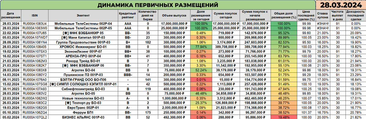 🤔 Друзья, статистика прорывалась сегодня сквозь технические невзгоды, но, вроде как, добралась целой и актуальной. Прошу к изучению, если любите такое) 1️⃣ Удивительно, но до финиша размещения сегодня удалось добраться лишь двум флоатерам МТСа $RU000A1083U4 $RU000A1083W0. Я, конечно, поздравляю, однако для меня стало сюрпризом то, что АГРОТЕК не смог раздать полностью два небольших выпуска. Собственно, отчасти поэтому технические трудности у меня и случились - таблички не были готовы к такому количеству зависшей первички, но зато теперь... :) 2️⃣ Опять ГК САМОЛЕТ $RU000A107RZ0 в посте, да. Но простите, игнорировать единоразовую продажу почти в сто миллионов сложновато. Слишком большое предложение на рынке, даже если ограничить пожелания девелоперами. А эмитенту, собственно, все равно, куда дальше цена пойдет - деньги то уже у него :) 3️⃣ Предпоследний ГАРАНТ-ИНВЕСТ $RU000A106SK2 - один из лидеров роста дня на самом заметном объеме. По окончании размещения последнего выпуска бумага