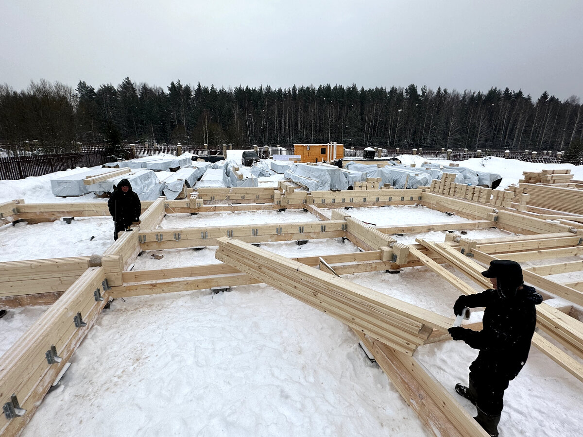 Несколько фотографий со строительной площадки, где ведутся начальные работы по сборке домокомлекта из клеенного бруса