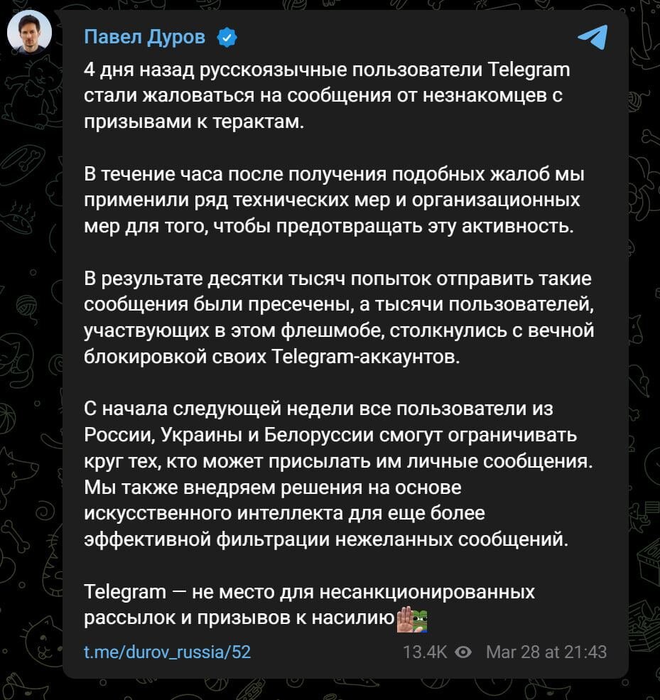 Павел Дуров после призыва Дмитрия Пескова в интервью SHOT — о более внимательной работе с опасной информацией в Telegram: "4 дня назад русскоязычные пользователи Telegram стали жаловаться на сообщения от незнакомцев с призывами к терактам. В течение часа после получения подобных жалоб мы применили ряд технических мер и организационных мер для того, чтобы предотвращать эту активность. В результате десятки тысяч попыток отправить такие сообщения были пресечены, а тысячи пользователей, участвующих в этом флешмобе, столкнулись с вечной блокировкой своих Telegram-аккаунтов. С начала следующей недели все пользователи из России, Украины и Белоруссии смогут ограничивать круг тех, кто может присылать им личные сообщения. Мы также внедряем решения на основе искусственного интеллекта для еще более эффективной фильтрации нежеланных сообщений. Telegram — не место для несанкционированных рассылок и призывов к насилию"