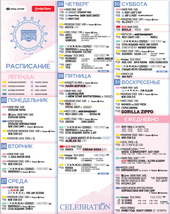 В 2024 году знаменитый спортивно-музыкальный мероприятие New Star Camp отметит свой пятнадцатилетний юбилей в горах, обещая участникам незабываемые впечатления. Это событие — истинный праздник души и тела, объединяющий спорт, музыку, захватывающие закаты и рассветы, а также непередаваемую атмосферу ежедневного торжества. Горы являются постоянным символом этого фестиваля на протяжении всех его 15 лет, в то время как остальные элементы, такие как музыкальные и спортивные мероприятия, культурные сессии, постоянно обновляются, преобразуясь и развиваясь с каждым разом. Фестиваль стал местом, где каждый может обрести что-то свое благодаря разнообразию предложений и способностям к переосмыслению. Теперь программа дополнена соревнованиями по сноуборду и фриски, сессиями йоги и фитнеса, экспозициями и мастер-классами от знаменитостей спортивного мира, а также культурными лекциями, мастерскими и киносеансами. Основываясь на ключевых составляющих фестивальной жизни, включая спорт, музыку, культур