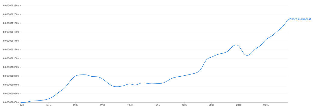 Изучая данные об инцесте по обоюдному согласию, была обнаружена интересная закономерность: с 1970 года интерес к инцесту по согласию возрос более чем в 190 раз. И у исследователей возник вопрос, является ли само это явление более распространенным сейчас, чем раньше, или о нем просто больше говорят? Лично я думаю, оба фактора имеют место быть.