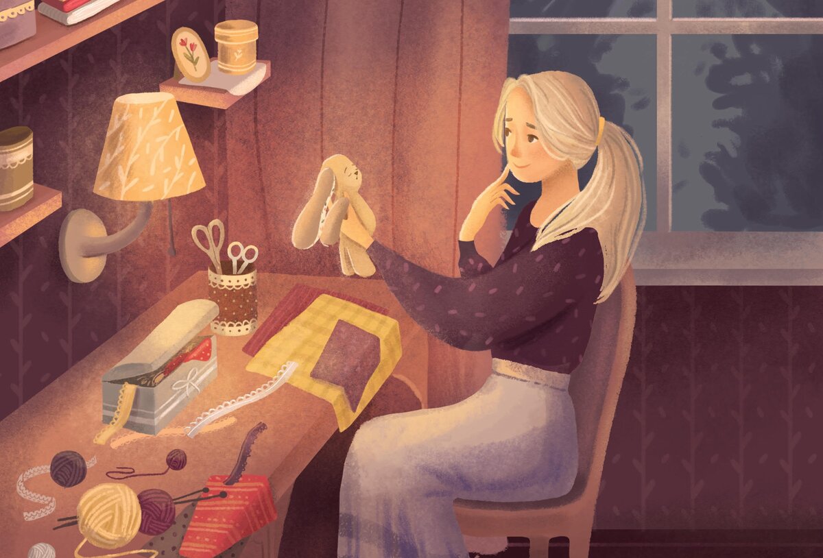 Прямо перед ней между отрезом хлопковой ткани с коралловыми розочками и мотком пряжи вкусного вишнёвого цвета происходило волшебство – создавалась игрушка. Круглая головка, тельце-капелька, ручки, ножки, длинные уши…