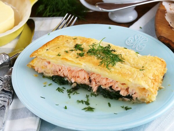 Горбуша, запеченная в духовке — сочная, мягкая и ароматная — очень легко готовится со шпинатом в слоеном тесте и соусе из белого вина. Это изысканное блюдо для романтического ужина или важного семейного обеда. Приготовить его не сложно, тем более что в рецепте используется покупное готовое слоеное тесто. Остальные ингредиенты — просты и немногочисленны, как всегда при приготовлении любого лосося, который сам по себе — уже шикарная и вкусная рыба. Этот рецепт простой и очень вкусный, для его приготовления подойдет филе любого лосося, семги, горбуши, форели, трески и пр. Добавленный шпинат можно заменить нежной молодой капустой. Рецепт рассчитан на 3 порции — для романтического ужина на двоих (плюс добавка для тех, кому рыба очень понравится). Однако можно сделать рецепт семейным, увеличив вдвое количество ингредиентов. Ингредиенты: Приготовление: Растопите сливочное масло на сковороде. Выложите шпинат. Тушите на небольшом огне, пока все листья не завянут. В конце приправьте солью и перц