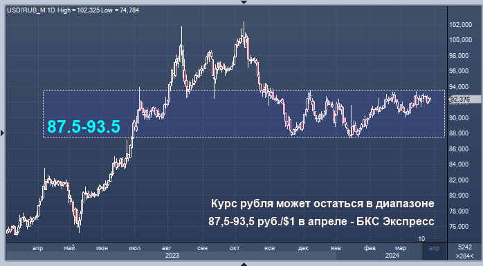 Курс рубля может остаться в диапазоне 87,5-93,5 руб./$1 в апреле - БКС Экспресс Курс доллар/рубля на Мосбирже интервалами в 1 минуту Курс доллар/рубля на Forex интервалами в 4 часа Курс рубля по отношению к доллару США может остаться в боковом диапазоне 87,5-93,5 руб./$1 в апреле, говорится в комментарии эксперта БКС Экспресс Михаила Зельцера. "Рубль в марте ослаб на 1,5%. Смотрим в контексте: на фоне жесткой среды и теракта такое отклонение относим к погрешности. Валютные барьеры со стороны спроса и предложения смогли "потушить" волатильность. Спрос на валюту купируется жесткой денежно-кредитной политикой ЦБ, до начала II полугодия не стоит ждать поблажек от регулятора. Предложение валюты расширяется за счет нормативов репатриации выручки экспортеров: в апреле могут быть корректировки нормативов, но полной отмены барьеров не ждем. Тем самым боковик в границах 93,5-87,5 руб./$1 может сохраниться и в апреле". - отмечает аналитик. MarketSnapshot - ProFinance.Ru в Telegram По теме: Инфляц