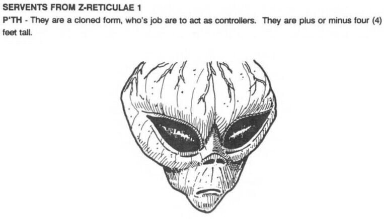 В: (Л) Я не указывала плотность. Лишь в нашей непосредственной планетарной области. (Т) Именно столько их работает в этом проекте. <…> (Л) У нас здесь есть несколько рисунков предполагаемых прислужников пришельцев [из буклета “Pulsar Project“]. <…> Хорошо, а вот это действительно приятный парень. Он настоящий?