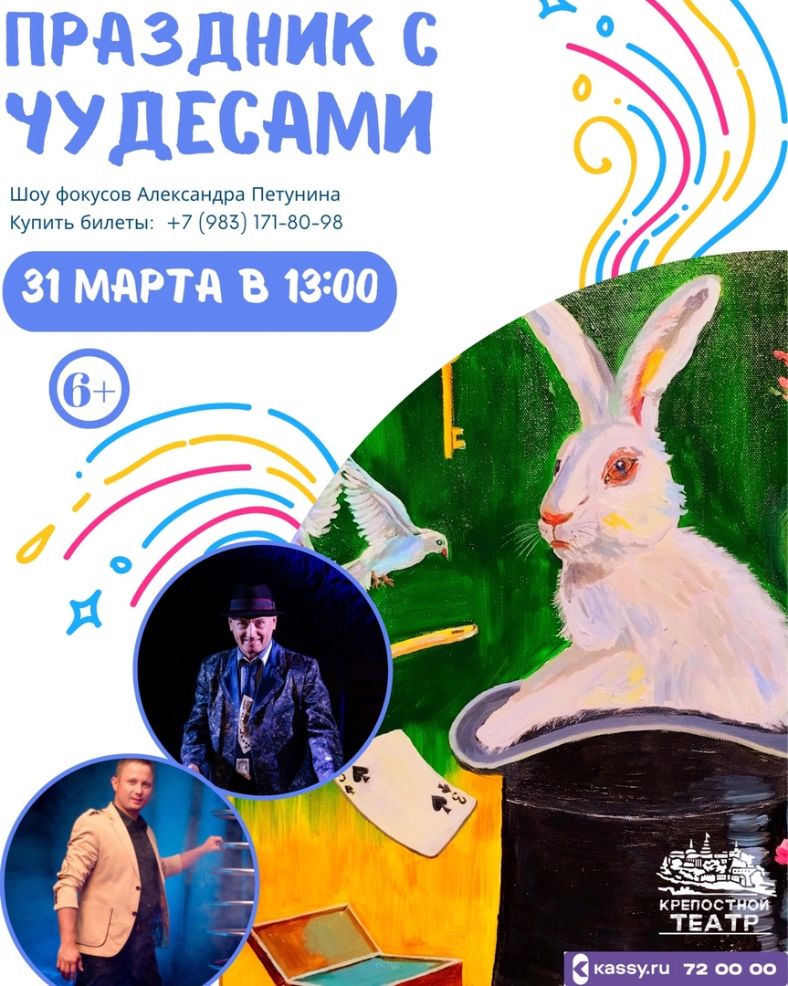 «Празднике с чудесами» – путешествие в мир иллюзий вместе с фокусниками Александром и Владимиром Петуниными. Фокусники станут проводниками для зрителей, желающих погрузиться в тайны разных уголков планеты, представив трюки и номера мирового класса. Подробнее