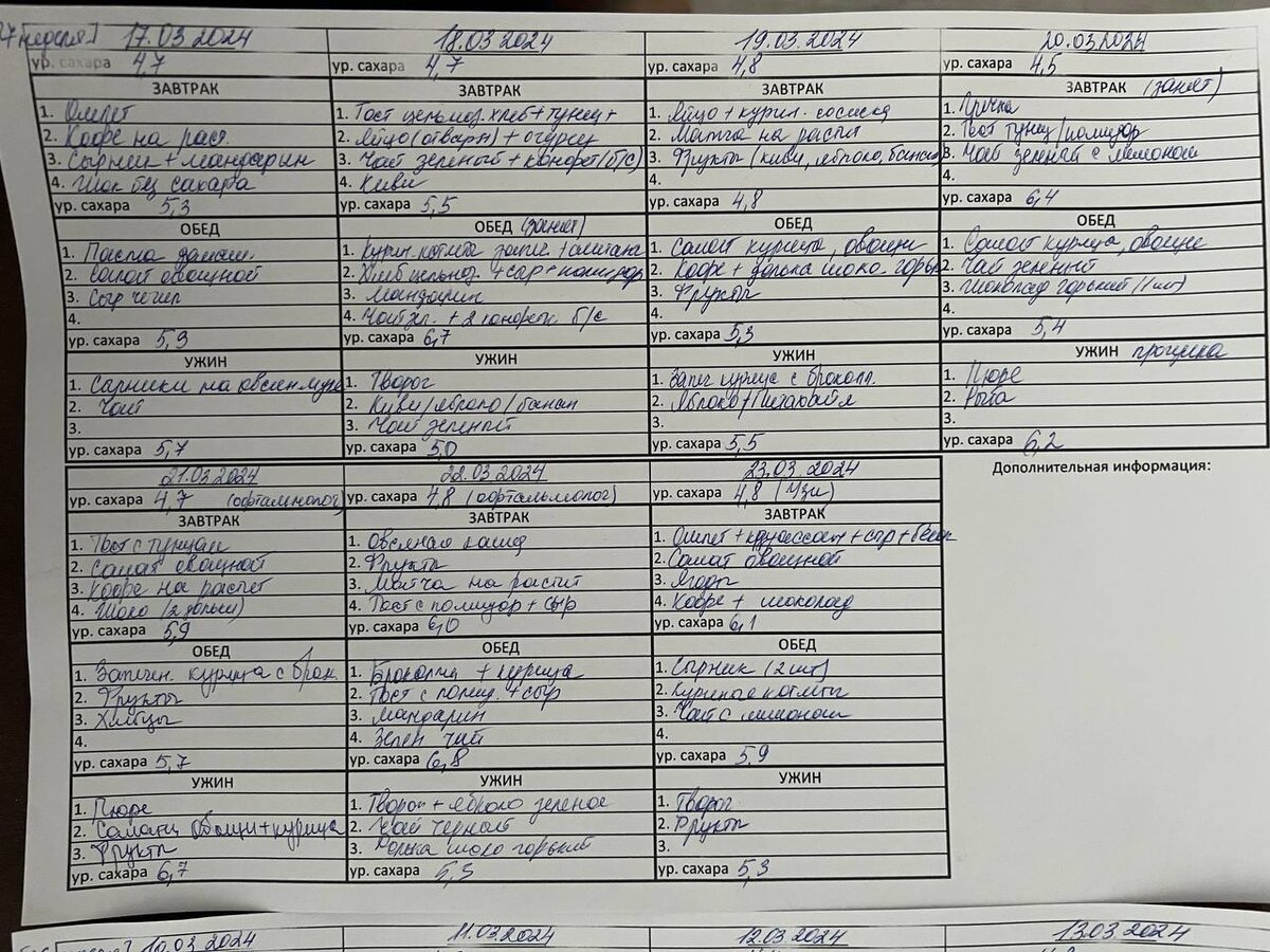 1) Питание с полным исключением легко усваиваемых углеводов и ограничением жиров. Рекомендованное количество углеводов - 175 г или не менее 40% от расчетной суточной калорийности питания под контролем гликемии. Углеводы распределяются на 3 основных приема пищи и 2-3 перекуса в день. Каждый прием пищи должен содержать медленно усваиваемые угл