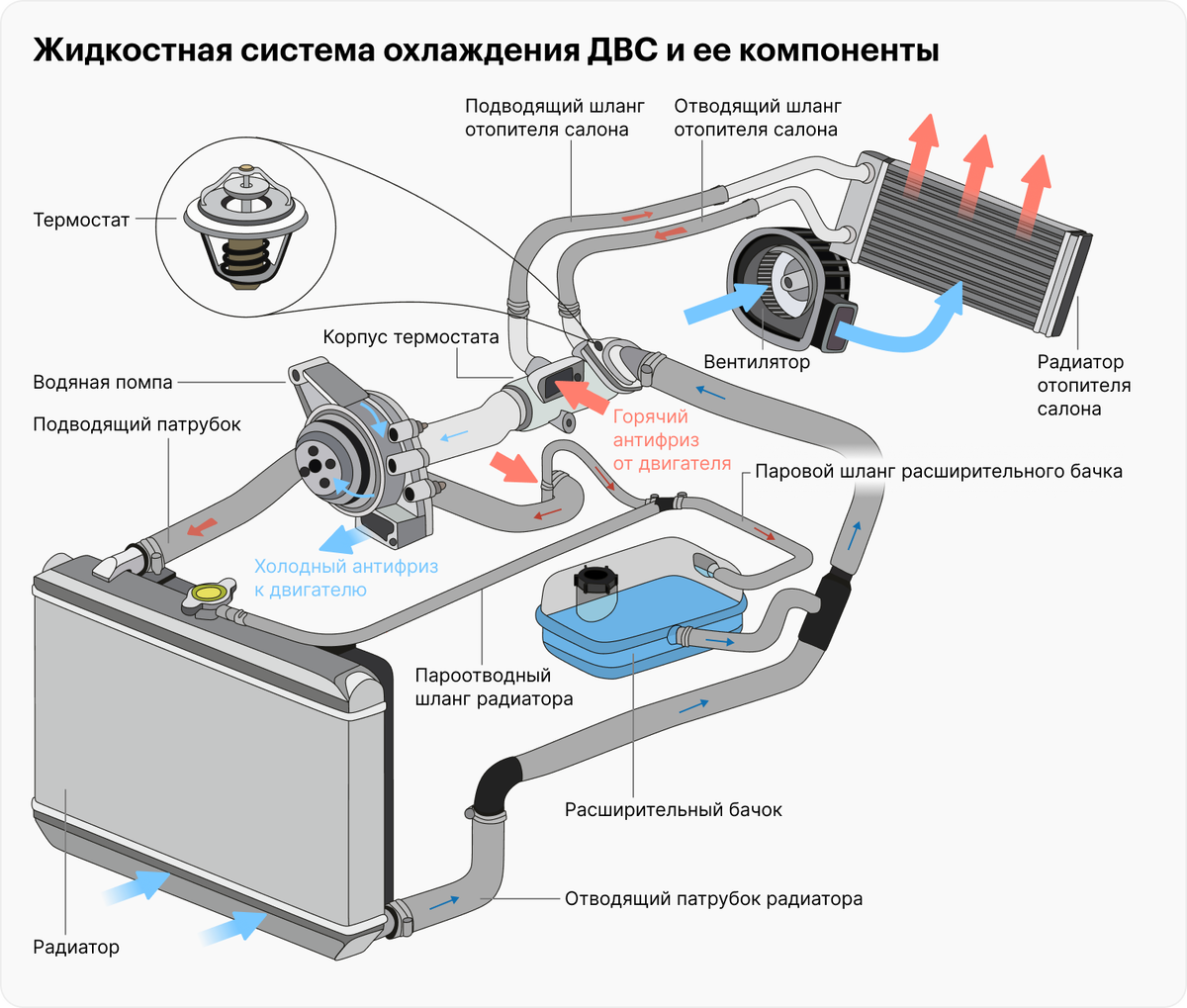 Перенаправлением охлаждающей жидкости между контурами заведует термостат. О том, как он устроен, где находится и как работает, можно прочитать в Учебнике. При достижении температуры 80–90°С клапан термостата открывается, и охлаждающая жидкость начинает движение по большому кругу.