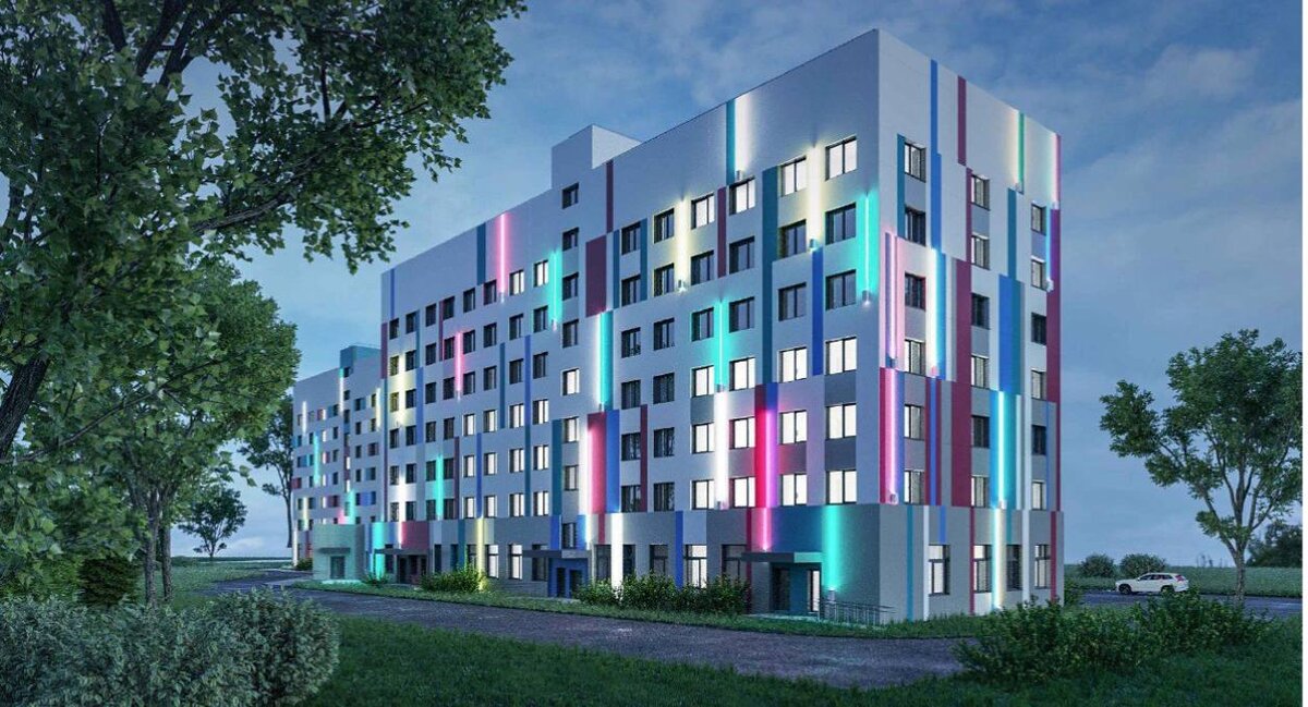 Площадь здания - более 13 тыс.кв. метров. Строители выполнили работы по фундаменту и подвальному этажу, приступили к возведению 2 этажа. Всего их - 8. Здесь будут общественные и административные помещения: медицинский пункт, тренажерный зал, буфет, актовый зал, помещения для персонала и охраны. Проживание будет организовано блоками по секционному типу, в каждом предусмотрены места общего пользования: кухня, санузел. 10 секций отведены для людей с ограниченными возможностями здоровья. На каждом этаже будет помещение для воспитателя, комната отдыха и комната для самоподготовки.