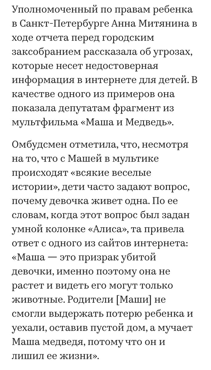 - Есть такие мультфильмы, в которых маленькая девочка дружит с медведем. Образ медведя в психоанализе прочно связан с сексуализированным насилием. Так вот, есть взрослые люди, залипающие на таких мультфильмах. По разным причинам, конечно же.