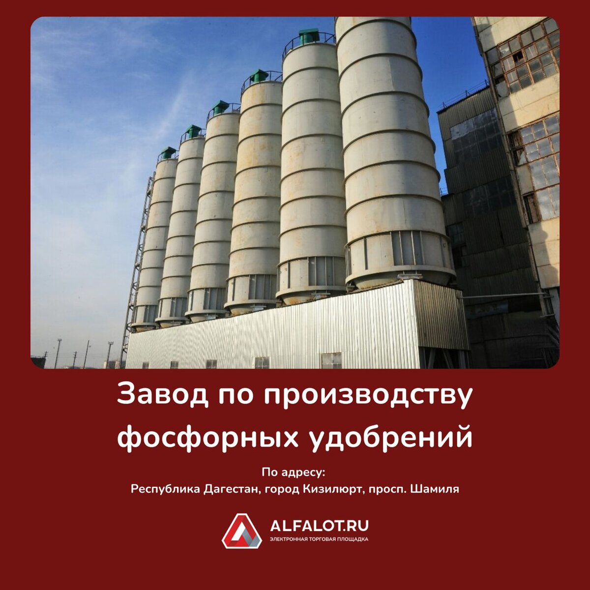 Продается комплекс по производству фосфорных удобрений в г. Кизилюрт, Республика Дагестан. Начальная цена реализации: 619 584 344,64 ₽ Цена отсечения: 520 450 849,50 ₽ Производственный комплекс по изготовлению фосфорных удобрений является единственным предприятием по выпуску дикальцийфосфата кормового и удобрительного в регионе и одним из крупнейшим в РФ. Производственная площадка АО «ДАГФОС» расположена на территории в 43 га. Имеется развитая инженерная инфраструктура – автодороги, ж/д ветка общей длиной 7 км. В составе торгов: ТОРГИ: ССЫЛКА НА ТОРГИ