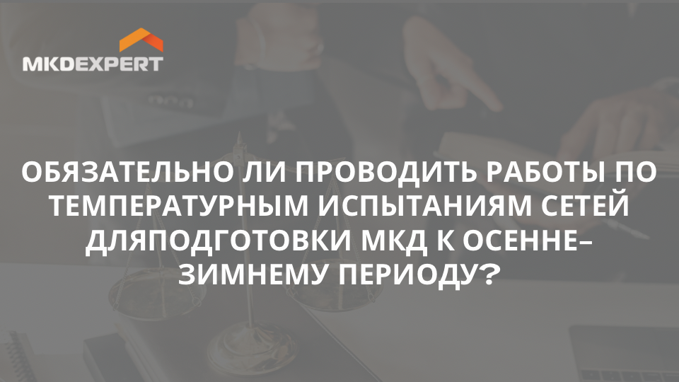 В новой статье помогаем читателю разобраться, являются ли работы по температурным испытаниям сетей обязательными при подготовке МКД к осенне-зимнему периоду https://mkdexpert.com/publikatsii/obyazatelno-li-provodit-raboty-po-temperaturnym-ispytaniyam-setey-dlya-podgotovki-mkd-k-osenne-zimne/