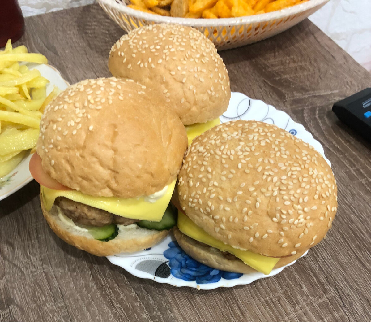 Нам понадобится🍜: булочки с кунжутом (можно купить в магазине как это сделала я ) сырный соус майонез огурцы помидоры фарш (можно купить готовый) плавленый сыр Приготовление:🍳 берем фарш и формируем одинаковые котлетки (у меня их было 3), на разогретую скотоводу наливаем подсолнечное масло и укладываем котлетки обжариваем с каждой стороны по 5-6 минут и потом накрываем крышкой и ставим на медленный огонь , пока готовится котлеты можно подготовить овощи , их нужно помыть и порезать на тонкие ломтики , булочки разрезать на два части и обжарить на разогретой сковородке без масла что бы образовалась легкая корочка, как приготовятся котлетки можно собирать наш бургер Сборка🥞: Промазываем майонезом булочки , на майонез кладем огурцы , потом котлетка, кладем ломтики помидора, промазываем сырным соусом(вы можете взять любой) и накрываем второй булочкой ,можно кушать🥣 Приятного аппетита🥪🍔