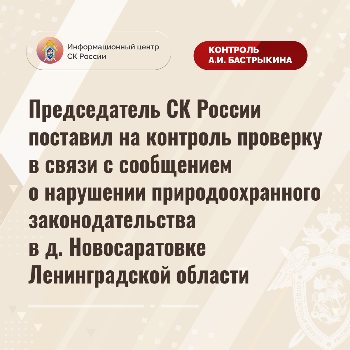 Председатель СК России поставил на контроль проверку в связи с сообщением о нарушении природоохранного законодательства в д. Новосаратовке Ленинградской области