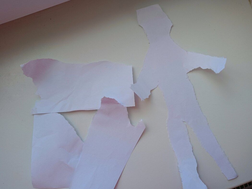 Психолог просит клиента взять лист в руки и оборвать его руками (без применения ножниц или других режущих средств) так, чтобы получился силуэт человечка.
