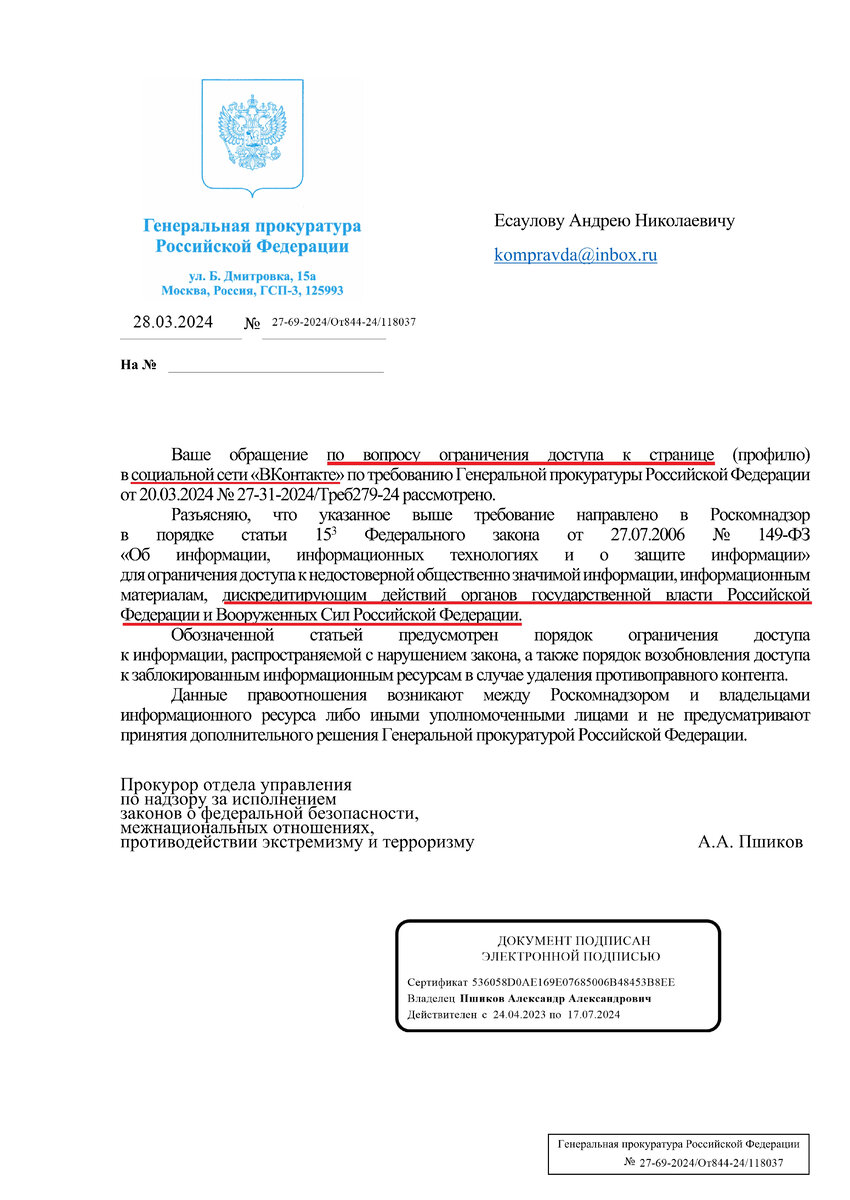 Как будто, из приговора суда нарушающего здравый смысл звучит: «За дискредитацию действий органов государственной власти и ВС РФ». И это о постах где речь идёт о подтверждённых фактах фальсификаций выборов и нарушении прав и свобод граждан?! Заблокированный аккаунт в России с таким обвинением, это ещё, как некоторые говорят повезло, повезло, что не посадили или не расстреляли? Проблема тут к сожалению не в людоедском и преступном режиме, а в гражданах отупевших от пропаганды ненависти за эти годы. Именно на них и опирается власть, по-крайней мере, на их молчаливое согласие творимому беспределу, а то и на радость тем, кто не осознаёт причинно следственных связей, между обстрелом Киева и Белгорода, отрезанного уха террористу и пытками в тюрьмах... Творя произвол, нарушая права человека, грабя и загоняя в кредитную кабалу, замещая коренное население страны мигрантами, клептократы подписывают смертный приговор народу, на чью долю выпали и без того, реки горя... Девиз власти: «Вы умрите сег