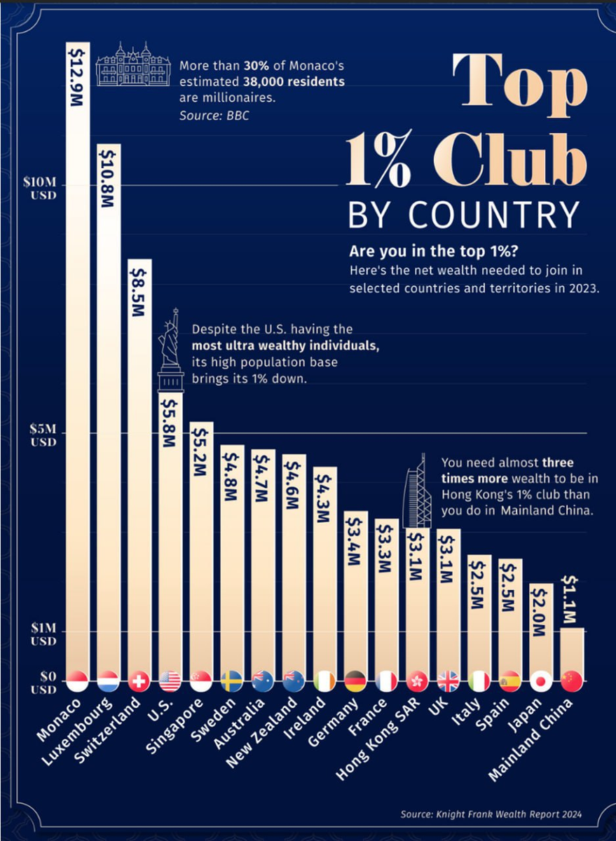 К 2022 году 1,1% взрослого населения мира были миллионерами по сравнению с 0,6% в 2012 году. Какое нужно иметь состояние, чтобы быть в клубе 1% богатейших людей в различных странах мира? Как оказаться в этом клубе? Чтобы войти в 1% самых богатых жителей по странам нужны разные капиталы. Например, в Монако нужно иметь 12,9 млн долларов США, в Люксембурге 10,8 млн долларов, в Швейцарии 8,5 млн долларов, в США 5,2 млн долларов. Полный список стран, где был проведен анализ, можно увидеть на графике ниже. Россию, к сожалению, в исследование не включили, хотя было бы интересно увидеть подобную аналитику. Чтобы стать частью клуба 1% самых состоятельных людей, в большинстве случаев требуется сочетание высшего образования, предприимчивости, стратегических инвестиций и даже удачи. Но стоит понимать, что не существует гарантированного пути к финансовому успеху, хотя состоятельные люди отмечают, что последовательность, правильные инвестиционные знания и время являются ключевыми факторами. Эко