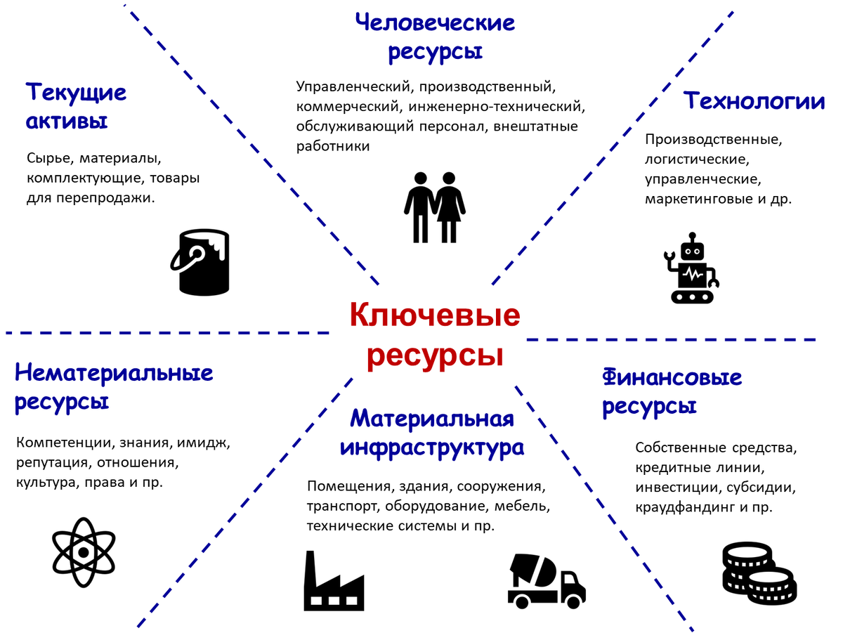 Один из важнейших этапов в технологии целевого управления KPI-Pro – это разработка бизнес-модели и стратегии компании. Практически в результате данного этапа мы заполняем новый шаблон бизнес-модели. И один из блоков в этом шаблоне описывает ключевые ресурсы, обеспечивающие конкурентоспособность вашей компании. Но почему именно ключевые? Что это такое? Без ресурсов жизнь людей и организаций невозможна. Мы все открытые системы. Но про людей пока не будем. Нас сейчас больше интересуют организации. Вообще, все организационные ресурсы можно разделить на следующие виды: 1. Текущие активы. 2. Материальная инфраструктура. 3. Технологическая платформа. 4. Человеческие ресурсы. 5. Финансовые ресурсы. 6. Нематериальные ресурсы. Можно подробно и тщательно расписать каждый из них, но думаю и так понятно, о чем речь. Но среди всех организационных ресурсов можно выделить ресурсы базовые и ресурсы ключевые. Базовые ресурсы – это ресурсы необходимые. Они обеспечивают жизнеспособность организации в прин