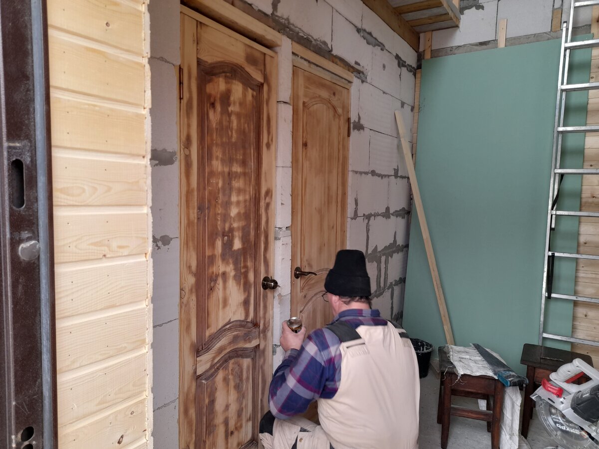 Продолжаем обшивать вагонкой входную зону в нашем новом дачном доме. Три стены у нас практически готовы, перешли к четвертой. Установили последнюю в этом помещении дверь. Это дверь в гардеробную комнату. Далее муж прикрутил к стене рейки для вагонки. За день большая часть стены была обита. Закупили новую партию вагонки, в этот раз сорта В. Эта вагонка намного качественнее вагонки сорта С, которую мы купили первой. В этой и сучков меньше и они все на месте. Вместе с вагонкой привезли доску 150х50 мм, металлический профиль и гипсокартон. Доску муж распустил на бруски 50х50 мм (так выходит выгоднее и бруски получаются нужного размера) и сделал межкомнатные стены на втором этаже. Со стороны комнат они будут обшиты гипсокартоном, а со стороны лестницы вагонкой. Между вагонкой и гипсокартоном уложим утеплитель.