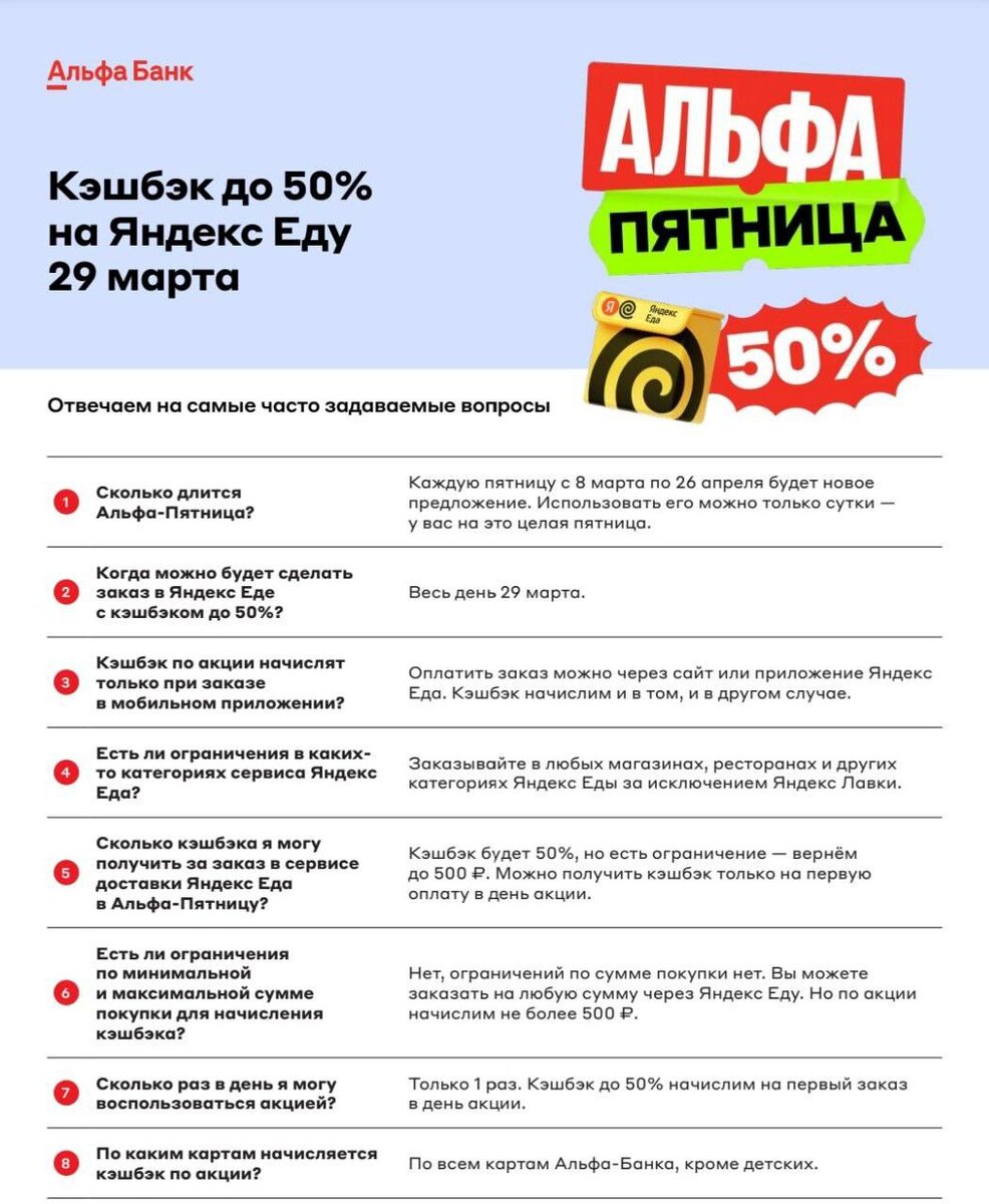 Кэшбек 50% на Яндекс еду 29 марта от Альфа банка (магазины и рестораны) 🔥😻