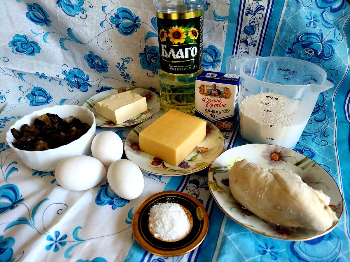 Рецептов пирогов, пирожков, кулебяк, расстегаев так много, что никто не берёт на себя смелость, даже примерно, сосчитать их количество. Хотелось бы предложить вам свой вариант. Это пирог с грибами из доступных продуктов. Это почти французский пирог (киш). Рецептов этого пирога много, но у меня есть свой. Для меня он самый удачный, потому что всегда получается и занимает немного времени. Для него подойдут любые грибы, как замороженные, так и свежие, когда они появятся в ваших лесах. Осталось совсем немного времени до той поры, когда уже начнут расти строчки, сморчки и шапочки сморчковые.. И тогда можно будет готовить с ними. А пока, готовимся к новому сезону и освобождаем наши морозилки от грибных запасов! Даже тем, у кого прошлогодние грибы уже закончились, не стоит печалиться! Для этого пирога подойдут и шампиньоны из магазина. Ведь классический киш, французы готовят именно с ними! Киш (открытый пирог) с курицей, грибами и сыром. Пошаговый рецепт. Ингредиенты: 1.) Охлаждённое в хол