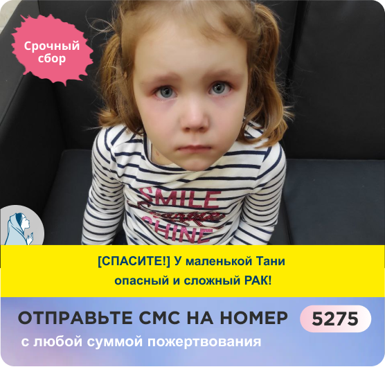 Мама очень боится, что доченьку не успеют спасти. Не дайте жизни Тани оборваться! Вы очень нужны ей именно сейчас! ПОМОЧЬ ТАНЕ СЕЙЧАС > У маленькой Тани опасный и сложный РАК. Её готовы спасти за рубежом, там, где есть большой опыт борьбы именно с таким редким РАКом. На родине нет времени проверять, подействует ли протокол. РАК не даёт времени на ошибку и на подбор протокола путём проб. Мама хотела отвезти дочь на обследование в Израиль, чтобы вернуться домой, и лечиться с уточнённым и конкретизированным протоколом. Но это очень трудно. "Таня не может проходить лечение в России, поскольку нужны дорогостоящие генетические исследования для определения мутаций. Заболевание очень редкое, а протокол отечественного лечения может оказаться для него неэффективным. Прошу, помогите оплатить лечение, которое спасёт мою дочь!" Мама. Протяните Тане руку помощи! Это спасёт жизнь! ПОМОЧЬ ТАНЕ СЕЙЧАС > Ровно год назад в области подвздошной кости у Танюши появилось странное уплотнение. Его размер был о