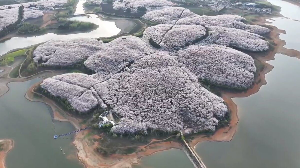 Тысячи вишен зацвели в округе Гуйяна, который также называют «городом тысячи парков». На кадрах ботанический сад, с высоты птичьего полета напоминающий огромный махровый ковер. Площадь парка составляет около 1 600 гектаров, в нем растет около десяти видов вишен, которые цветут с конца марта до конца апреля.