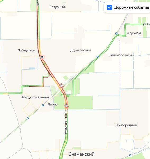 Пятница не стала исключением. К 15:00 затор на обходе растянулся примерно на 9 километров. Движение стоит на участке от посёлка Лазурного и до посёлка Лорис. Судя по данным ресурса «Яндекс. Карты», на проезд этого отрезка пути водителям придётся потратить 1 час 12 минут. Скриншот "Яндекс. Карты"