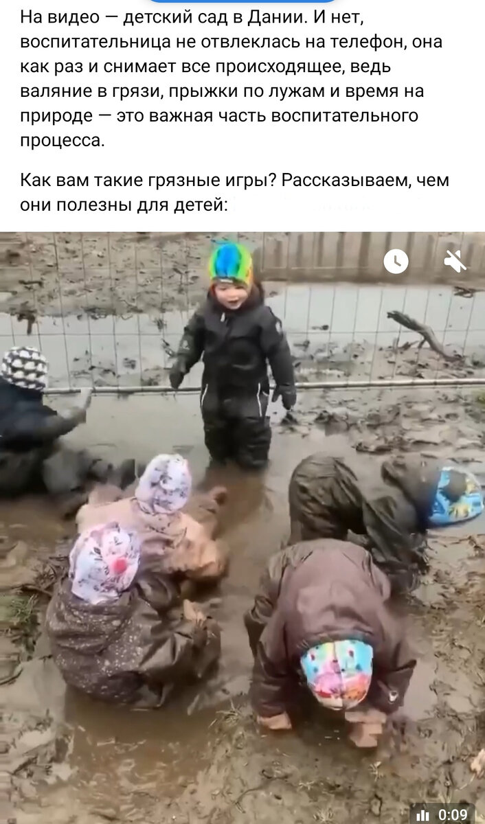 Всем привет! Тут порадовали, скинули из ВК картинку. Там малыши играют в грязи (не просто в грязи, а я бы сказала "по уши в грязи"), с подписью, что это - детский сад в Дании, и что так и надо. Вот: Собственно, для ленивых (без обид, я тоже себя отношу к этой лиге) сразу моя ремарка: НИЧЕМ такие игры не полезны, в плане иммунитета. Если там какие-то психологические моменты обыгрываются - тогда ладно. В конце концов, играть в грязи - это просто красиво весело! Но практически бесполезно для "укрепления иммунитета" и прочих достижений. Я конечно перешла по ссылке (на скрине - замазала, а потом подумала, а зачем? Ну уже лень менять). Там написано разное. Например: Микробиолог и иммунолог Мари Рубуш утверждает, что «контакт с грязью помогает детям укрепить иммунную систему, которая обеспечивает им защиту на всю жизнь». Гигиеническая гипотеза? Такая существует, да. Правда в ней не говорится, что детям нужно болеть для укрепления иммунитета. Гипотеза пытается связать повышение уровня гигие