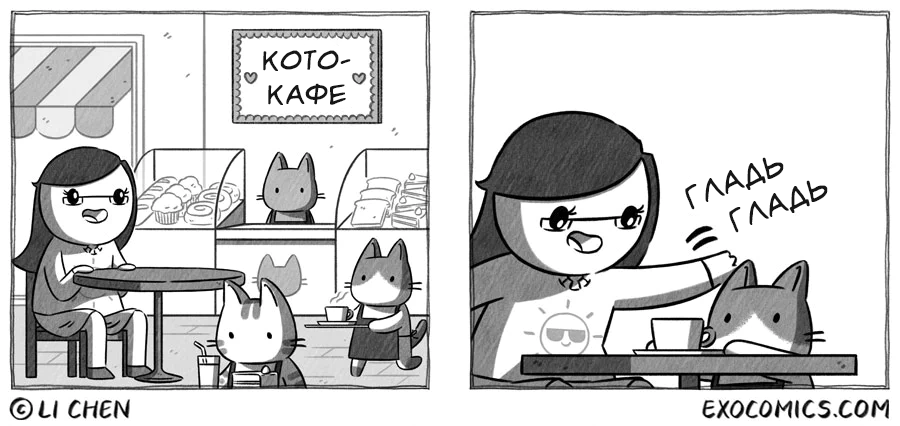 Сейчас в сети есть полно комиксом на любой вкус. И юмор в них тоже может быть самым разным - от простого и житейского до абстрактного и экспериментального. Ну а если вам хочется чего-то милого, забавного и слегка странноватого, то работы героини сегодняшней статьи как раз для вас! Эти комиксы уже успели завоевать сердца сотен тысяч людей и, я надеюсь, что они понравятся и вам. Тем более, что в этих зарисовках, как минимум, присутствуют котики, а котиков любят все (ну, или почти все). Extra Ordinary Comics (англ. «Экстраординарные комиксы») - это серия юмористических комиксов, которая была создана новозеландской художницей китайского происхождения по имени Ли Чен (Li Chen). Серия была запущена в 2009 году и продолжает активно выходить до сих пор - новые выпуски появляются в сети каждую неделю: их можно найти в соцсетях (легко ищется по нику exocomics), а также на официальном сайте проекта. В данный момент за комиксами Ли Чен следят более 300 тысяч подписчиков. А в октября этого года у Л