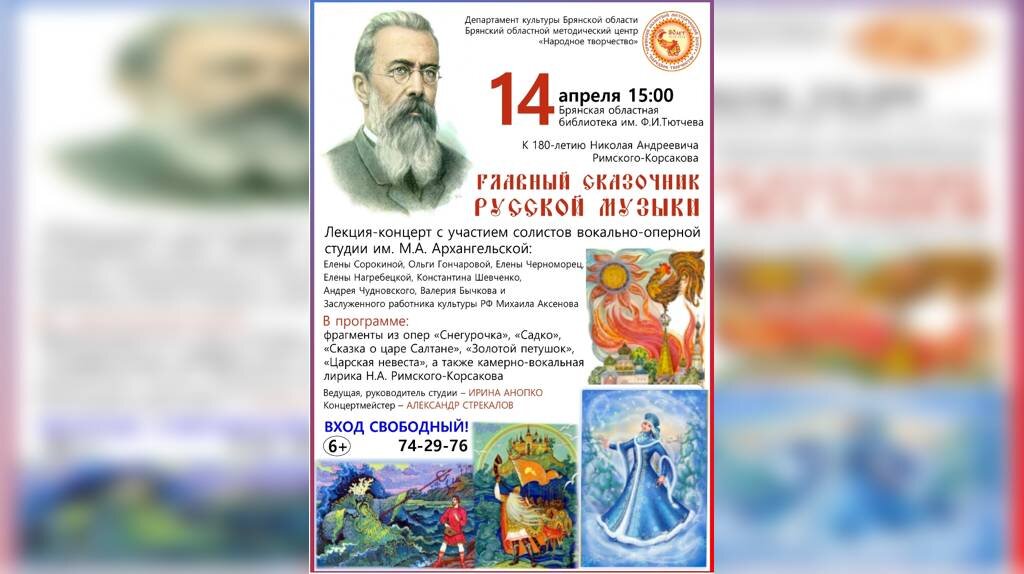 В Брянской областной библиотеке им. Ф.И. Тютчева состоится концерт «Главный сказочник русской оперы», посвящённый 180-летию великого русского композитора Николая Андреевича Римского-Корсакова. Мероприятие пройдет в воскресенье, 14 апреля. Начало в 15 часов. В исполнении солистов народной вокально-оперной студии им. М.А. Архангельской прозвучат фрагменты из опер Н.А. Римского-Корсакова «Снегурочка», «Садко», «Золотой петушок», «Сказка о царе Салтане» и «Царская невеста». Концертмейстер – пианист и композитор Александр Стрекалов. О жизни и творчестве великого русского композитора, об истории создания знаменитых опер расскажет ведущая и руководитель студии Ирина Вячеславовна Анопко. 6+ В Брянске состоится концерт к 180-летию Николая Римского-Корсакова