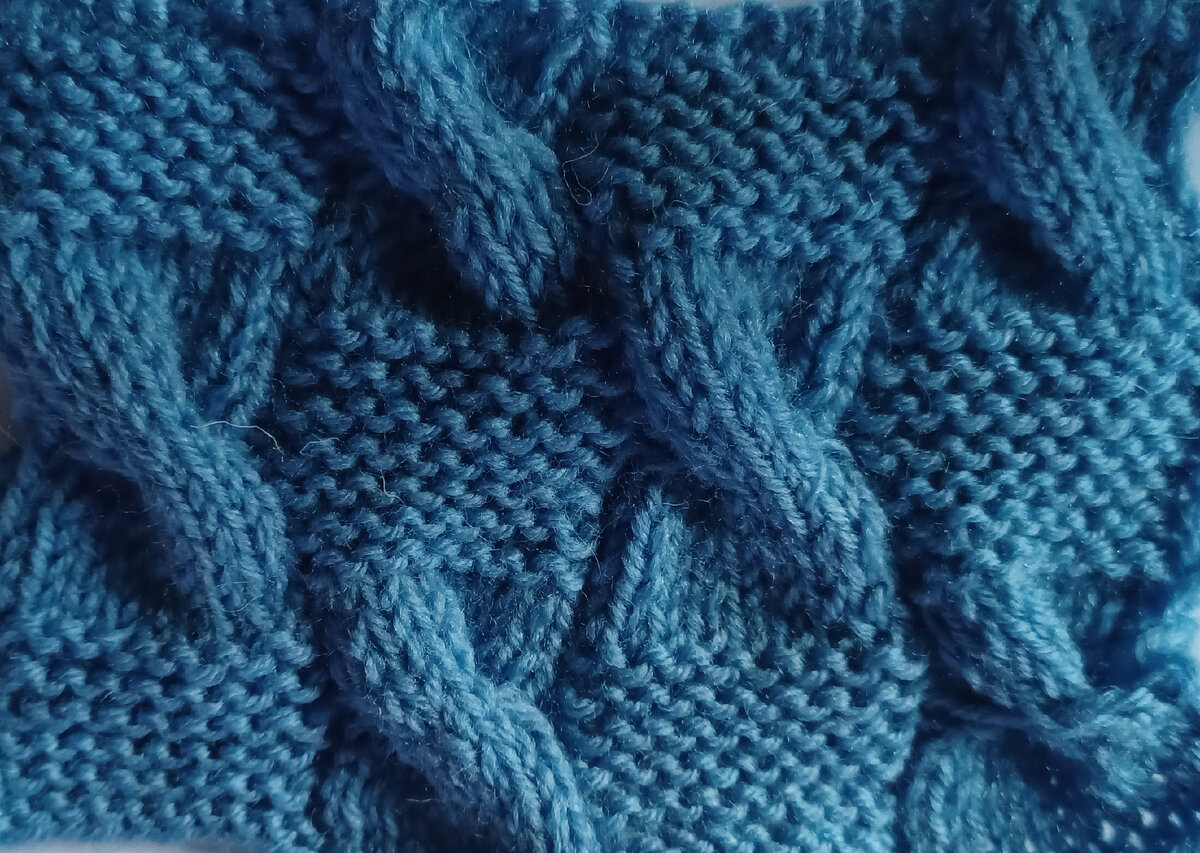 Рельефный узор спицами, выразительную фактуру которого создают участки платочной вязки, которые чередуются с прекрещенными петлями. Полотно получается в меру объемным, мягким и в то же время формоустойчивым. Этот узор прекрасно подойдет для вязания шапок, свитеров. Раппорт узора по ширине 18 петель, по высоте 24 ряда. Для образца узора набирают на спицы количество петель кратное 18 плюс 1 петля для симметрии узора, плюс 2 кромочные петли. 1, 3, 5, 9, 11, 13, 15, 17, 21, 23 ряд: * 1 изнаночная, 8 лицевых, 1 изнаночная 8 лицевх *, 1 изнаночная; 2, 4, 6, 8, 10, 12 ряд: 1 лицевая, * 8 изнаночных, 10 лицевых *; 7 ряд: * 1 изнаночная, 8 лицевых, 1 изнаночная, перехват из 8-ми лицевых петель с наклоном влево *, 1 изнаночная; 14, 16, 18, 20, 22, 24: 1 лицевая, * 9 лицевых, 8 изнаночных, 1 лицевая *; 19 ряд: * 1 изнаночная, перехват из 8-ми лицевых петель с наклоном влево, 1 изнаночная, 8 лицевых *, 1 изнаночная. Узор повторяется с 1 по 24 ряд. Схема вязания узора