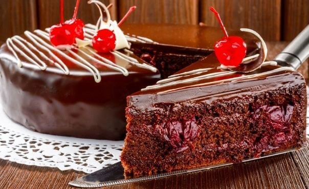 Ингредиенты: Для теста: Яйца — 4 шт. Сахар — 2 стак. Сгущенное молоко — 380 мл Сметана — 500 мл Сода — 1 ч. л. Какао-порошек — 3 ст. л. Мука — 2 стак. Для начинки: Свежие или замороженные вишни — 500 г Ром, водка или коньяк — 200 мл Сливочное масло — 200 г Сгущенное молоко — 380 мл Ванильный сахар — по вкусу Для шоколадной глазури: Сливочное масло — 50 г Молоко — 2 ст. л. Какао-порошк — 3 ст. л. Сахар — 2 ст. л. Приготовление: 1. Вишни перебрать, удалить косточки. Если замороженная — разморозить. Залить ягоды ромом или коньяком и оставить на 12–24 часа. 2. Яйца взбить с сахаром в густую пену, добавить сметану, сгущенку, соду, погашенную уксусом. Муку смешать с какао и в несколько приемов добавить в тесто. Хорошо вымешать. Вылить в смазанную маслом глубокую форму. Выпекать в разогретой духовке на среднем огне. Первые 20 минут дверцу духовки не открывать. Проверить готовность, воткнув зубочистку: если она выходит сухой, корж готов. Достать тесто из духовки и полностью остудить.