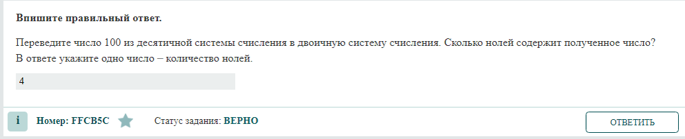 Переведите число 100 из десятичной системы счисления в двоичную систему счисления. Сколько нолей содержит полученное число? В ответе укажите одно число – количество нолей. ЧТО НУЖНО ЗАПОМНИТЬ? Правила перевода из десятичной системы счисления в двоичную С помощью деления на два. 1. Последовательно выполнять деление исходного целого десятичного числа и получаемых целых частных на 2. 2. Записать полученные остатки в обратной последовательности. Пример: Переведем число 105 из десятичной системы счисления в двоичную: 105/2=52 (ост. 1) 52/2= 26 (ост. 0) 26/2=13 (ост. 0) 13/2= 6(ост. 1) 6/2= 3(ост. 0) 3/2 = 1(ост. 1) 1/2= 0 (ост. 1) Переписываем снизу вверх 105₁₀ = 1101001₂ РЕШЕНИЕ 100/2=50 (ост. 0) 50/2=25 (ост. 0) 25/2=12 (ост. 1) 12/2=6 (ост. 0) 6/2=3 (ост. 0) 3/2=1 (ост. 1) 1/2= 0 (ост. 1) Переписываем снизу вверх: 100₁₀ = 1100100₂ В ответ необходимо записать количество нулей в числе - 4. ОТВЕТ 4