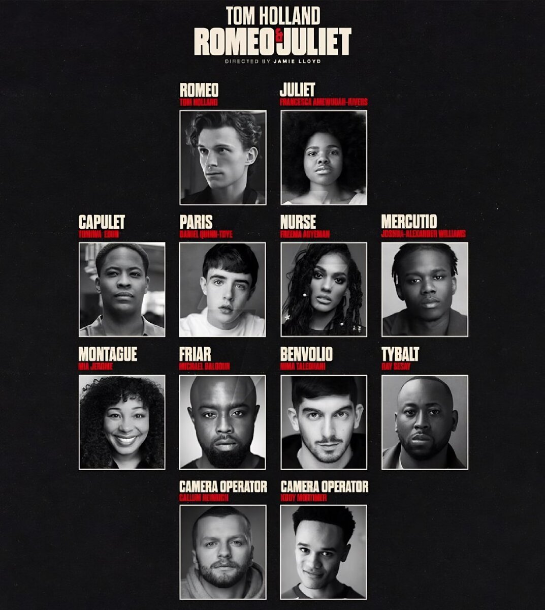 Показали полный актёрский состав нового спектакля по «Ромео и Джульетте» В роли Ромео — Том Холланд, а Джульетту сыграет… британская актриса Франческа Амевуда-Риверс. Кажется, все забыли, что действие трагедии происходит в Италии в начале 16 века, а главные герои — веронская аристократия. Все в семье чистокровные итальянцы
