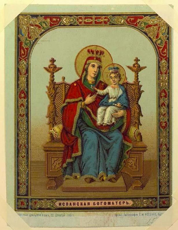 Эта икона была явлена в VIII веке. В 718 году по молитвам перед этой иконой царем Испанским Пелагием была одержана победа над сарацинами. И в этом же году на востоке император Лев Исаврянин разгромил сарацинов. В честь этих побед и было установлено празднование Испанской иконе Богородицы. Тропарь перед иконой Испанская: Чуде́с исто́чник неизсяка́емый/ о́браз Твой, Де́во Госпоже́, нам дарова́ся,/ наде́жду обурева́емым и стра́ждущим да́руяй/ и цельбы́ оби́льныя неду́жным излива́яй,/ его́же иму́ще я́ко зна́мение заступле́ния Твоего́,/ Кресто́м Сы́на Твоего́ огражда́еми побежда́ем враги́/ и Тебе́, Цари́це на́шей и Влады́чице,// велегла́сную прино́сим похва́льную песнь. Празднование этому образу совершается 21 апреля. Пресвятая Богородица, спаси нас!