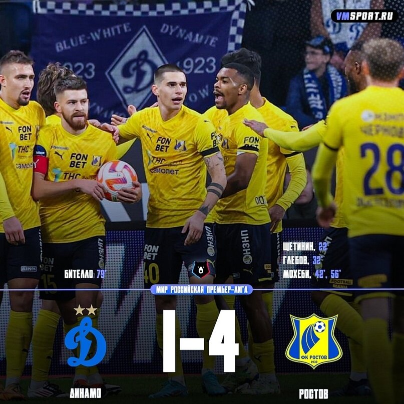 4:1 С таким счётом "Ростов" одерживает победу над "Динамо" в матче 22-го тура МИР Российской Премьер-Лиги.