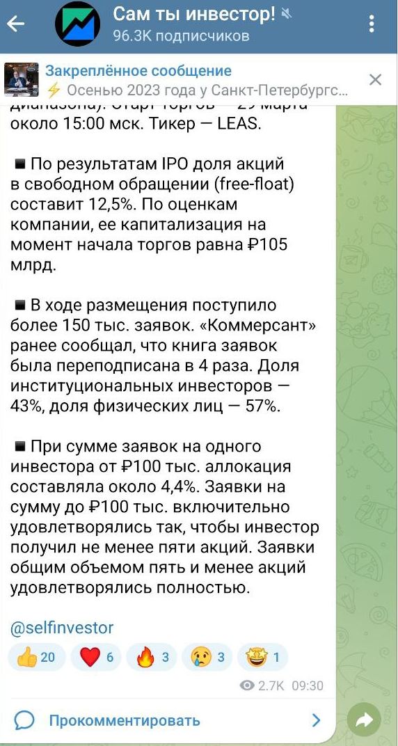 В пятницу Московская биржа подвела итоги размещения акций лизинговой компании Европлан, а сами бумаги упали на счета инвесторов и начались торги. Пора подводить итоги и делать выводы! Книга заявок переподписана 4 раза Поскольку книга заявок в первый раз была подписана почти сразу же после начала размещения, было понятно, что IPO пройдет по верхней границе и аллокация будет меньше 100%. Так оно и произошло. Получается, что инвесторы приобрели акции по 875 рублей за штуку. Я долго сомневалась, стоит ли участвовать в данном размещении потому, что понимала, что сейчас я могу заниматься только реинвестированием денег полученных от своих фьючерсов. Собственно сейчас все деньги я вкладываю во фьючерс на индекс Московской биржи, поэтому у меня был простой выбор: IPO или фьючерс. Я решила для разнообразия все-таки подать 2 заявки по 10 000 рублей, дабы поступившая вариационная маржа позволяла мне сделать только это. На свои 2 заявки я получила 5 акций! То есть по одной заявке 2, а по другой 3