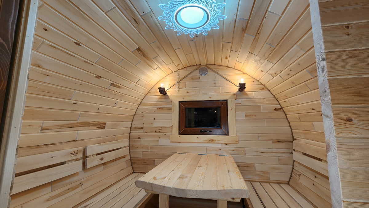 Комната отдыха небольшая, но вместительная: лавочки, трансформирующиеся в большую кровать, откидной стол, шкаф на 4 полки — что ещё нужно для комфортного отдыха? В парной тоже уютно: широкий полок, небольшое окошко, лавочки. Вода подведена отдельно, есть водонагреватель для комфортного использования, пароперегреватель. Печь установлена с наружной топкой, под 120 кг габбро-диабаза, однако напомним, что выбрать печь для бани-бочки можно и другой ком