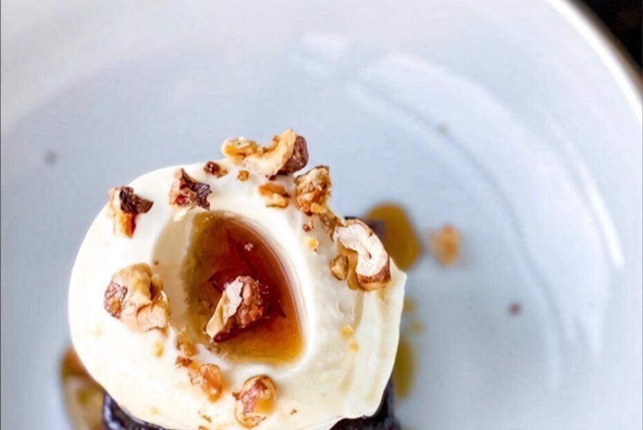 Соль 1 г ИНСТРУКЦИЯ ПРИГОТОВЛЕНИЯ 1.Соединить овсяные сливки, ваниль, сироп томинамбура, 10 грамм кокосового сахара, камедь рожкового дерева, нагреть, помешивая, до 80 градусов. Потом вылить в форму и поставить в морозилку. При температуре –10 градусов понадобится 3–4 часа на застывание. Раз в полчаса мороженое нужно перемешивать. Готово оно будет, когда приобретет текстуру, приятную для употребления. 2.Шоколад растопить, добавить к нему размягченный банан, 49 грамм кокосового сахара и муку. Взбить все вместе, разложить по небольшим формам — около 70–90 грамм на порцию. 3.Выпекать при 180–200 градусах 4–5 минут. Получится влажный кекс, как брауни или фондан. 4.Грецкие орехи слегка намочить в