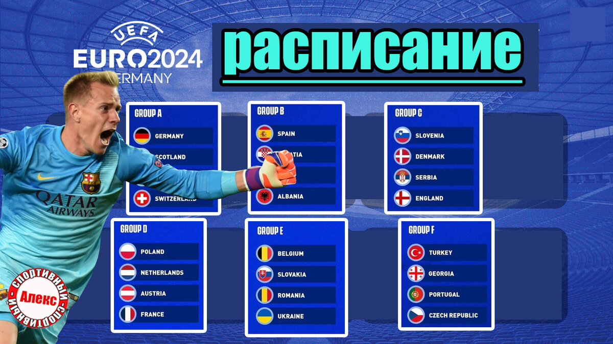 Здравствуйте, уважаемые любители футбола. Определились все участники чемпионата Европы 2024 г. Как известно, турнир пройдёт с 14 июня по 14 июля. Лови полное расписание всех групп. В первом квартете стартовый тур начнётся 14 июня, когда хозяйка Германия в замечательном городе Мюнхен, что расположен на юге страны, встретится с Шотландией. Игру посетят 70 тысяч зрителей. Запоминайте – это второй по вместимости стадион турнира. На следующий день в Кёльне, что на западе Германии, Венгрия померяется силами со Швейцарией. Во втором туре, 19 июня, Германия ждёт Венгрию. Матч запланирован в Штутгарте. Это южнее Мюнхена. Шотландия откроет свои двери швейцарам (швейцарцам). 3-й тур пройдёт 23 июня. Швейцария будет номинальной хозяйкой в игре с Германией во Франкфурте-на-Майне, который расположен в центре. А город-моторов Штутгарт примет игру Шотландии и Венгрии. Как вы догадались, дорогие друзья, лишь немцы в этой группе были чемпионами Европы, причем трижды. Смотрим увлекательную группу В. 1-й